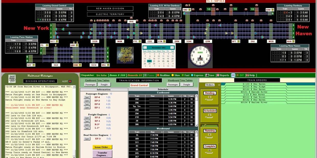 New Haven Dispatcher is a simulation of this corridor and this time. It contains every regularly scheduled passenger and freight train for November 1943. Second sections, troop trains, extra freights, POTUS, and a Wire Train are added to complicate operations. That's over 400 daily trains!!! Add in disasters caused by overworked equipment and there are a lot of problems to solve to keep things moving and on time.